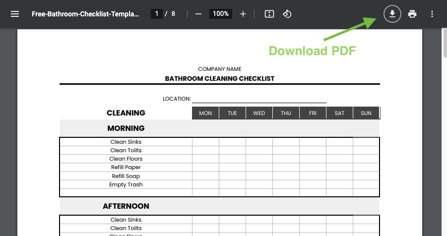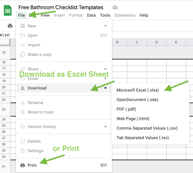 Open the sheet and download or print the bathroom checklist for your own business.
